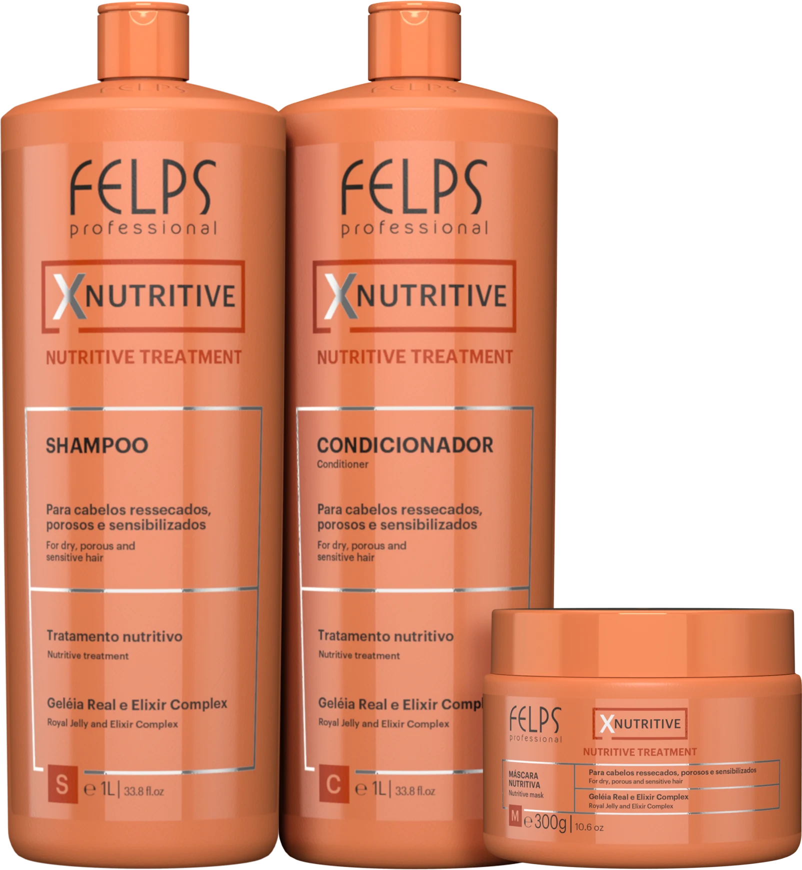 Kit em tamanho profissional com shampoo, condicionador e máscara para cabelos ressecados, porosos e sensibilizados. Felps Professional XNutritive Trio Salon limpa, repõe os nutrientes e hidrata intensamente os fios.