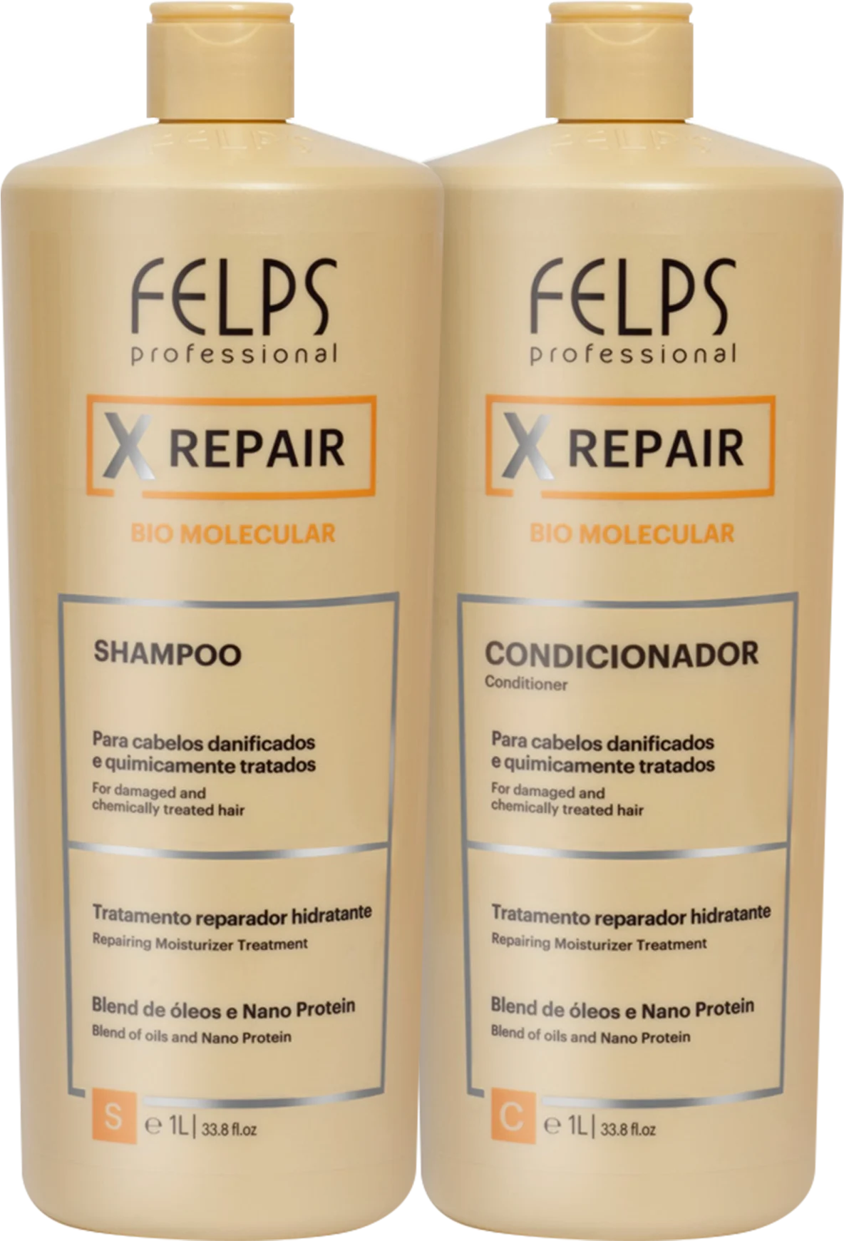 Kit em tamanho profissional para cabelos danificados e quimicamente tratados. Kit Felps Professional XRepair Bio Molecular Salon Duo hidrata e recupera os fios dos procedimentos químicos para prevenir da quebra. Ele consegue devolver o brilho e maciez no cuidado diário.
